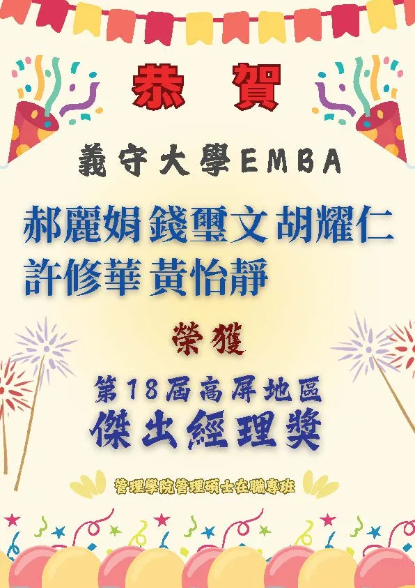 【榮譽】本所同學榮獲第十八屆高屏地區【傑出經理獎】。