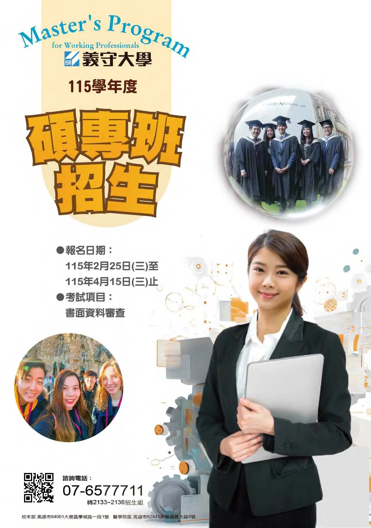115學年度研究所碩士在職專班招生商管領域:管理學院碩士在職專班(EMBA、PMBA)一律網路報名,報名後請務必將備審資料上傳至報名系統,本考試不接受備審資料紙本件。網路登錄報名時間:115.02.25(三)~115.04.15(三)※以同等學力第七條「專業領域具卓越成就表現者」報考者報名時間:115.02.25(三)~115.03.25(三)報名網址:網路報名系統